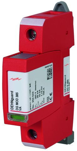 Einpoliger Überspannungsableiter DEHNguard S VA, Typ 2 nach EN 61643-11, bestehend aus Basisteil und Varistor-Funkenstrecken-Reihenschaltung im Schutzmodul. Hohe Gerätesicherheit durch Ableiterüberwachung mit Thermo-Dynamik-Control. Zum Schutz von Niederspannungs-Verbraucheranlagen vor Überspannungen. Zum Einsatz im Blitz-Schutzzonen-Konzept an den Schnittstellen 0B – 1 und höher.