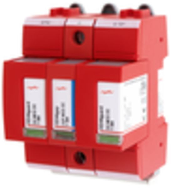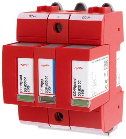 Dreipoliger, modularer, steckbarer Kombi-Ableiter Typ 1+2 DEHNguard ME DC Y 1000 FM für Gleichstromanwendungen mit mechanische Funktions-/Defektanzeige. Ableiter Typ 1+2 analog zu EN 61643-11, Y-Schaltung bestehend aus leckstromfreier Varistor-Gasableiter -Technologie. Speziell für den Einsatz in DC-Stromkreisen bis 1000 V geeignete DC-Schaltvorrichtung DCD.