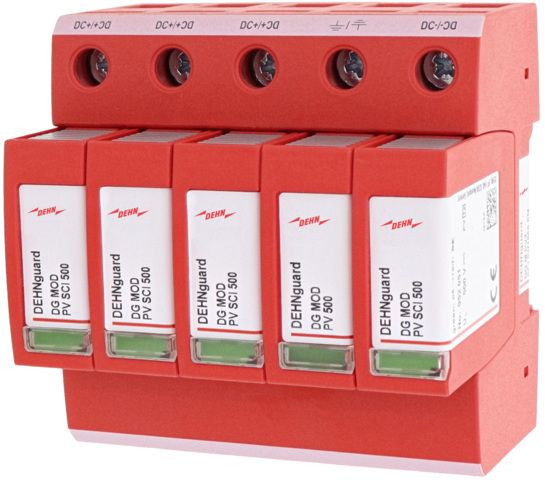 Mehrpoliger Überspannungsableiter DEHNguard M PV2 SCI, Typ 2 nach EN 61643-31 zum Schutz von 3 MPP-Eingängen. Die dreistufige DC-Schaltvorrichtung, bestehend aus Basisteil und gesteckten Schutzmodulen, mit kombinierte Abtrenn- und Kurzschließvorrichtung mit sicherer elektrischer Trennung im Schutzmodul. Zum Schutz von Niederspannungs-Verbraucheranlagen vor Überspannungen. Zum Einsatz gemäß IEC 60364-7-712:2002-05 (Errichten von Photovoltaik-Versorgungssystemen).