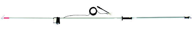 Resistiver, einschenkeliger Gleichspannungsprüfer PHE/G für Fahrdrahtleitungen, Ausführung Pluspol auf Prüfkopf, als zusammengehörige Bauart in Anlehnung an DIN VDE 0682-411 (EN/IEC 61243-1) zum Feststellen der Spannungsfreiheit durch Antasten an der Arbeitsstelle nach DIN VDE 0105-100 (EN 50110-1) in elektrischen Anlagen bis 3 kV DC. Erdseitige Klemme mit Drehgriff. Auch bei Niederschlägen verwendbar.