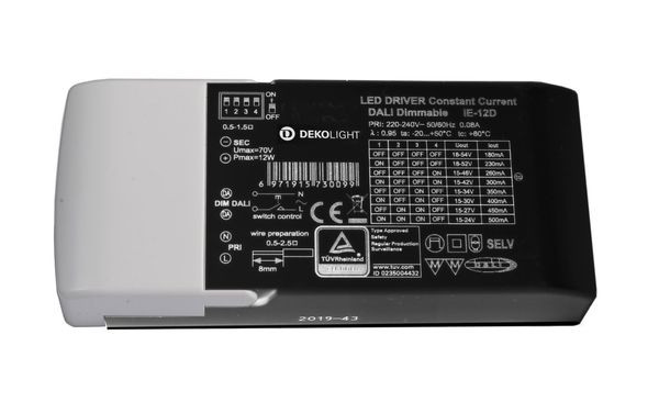 Deko-Light, Netzgerät (CC, DC) dimmbar, BASIC, DIM, Multi CC, IE-12D, Stromkonstant, Dimmbar: Ja, DALI 2.0 / DT6, Intelli Push-Dim, 3,2-12,0 W, Eingangsspannung: 220-240 V/AC, Ausgangsspannung: 15-52 V/DC, IP 20