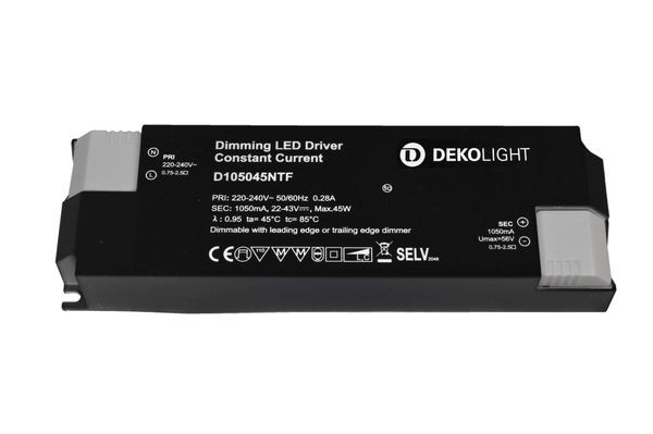 Deko-Light, Netzgerät (CC, DC) dimmbar, BASIC, DIM, CC, D105045NTF/45W, Stromkonstant, Dimmbar: Ja, Phasenabschnittsdimmer, 23,0-45,0 W, Eingangsspannung: 220-240 V/AC, Ausgangsspannung: 22-43 V/DC, IP 20