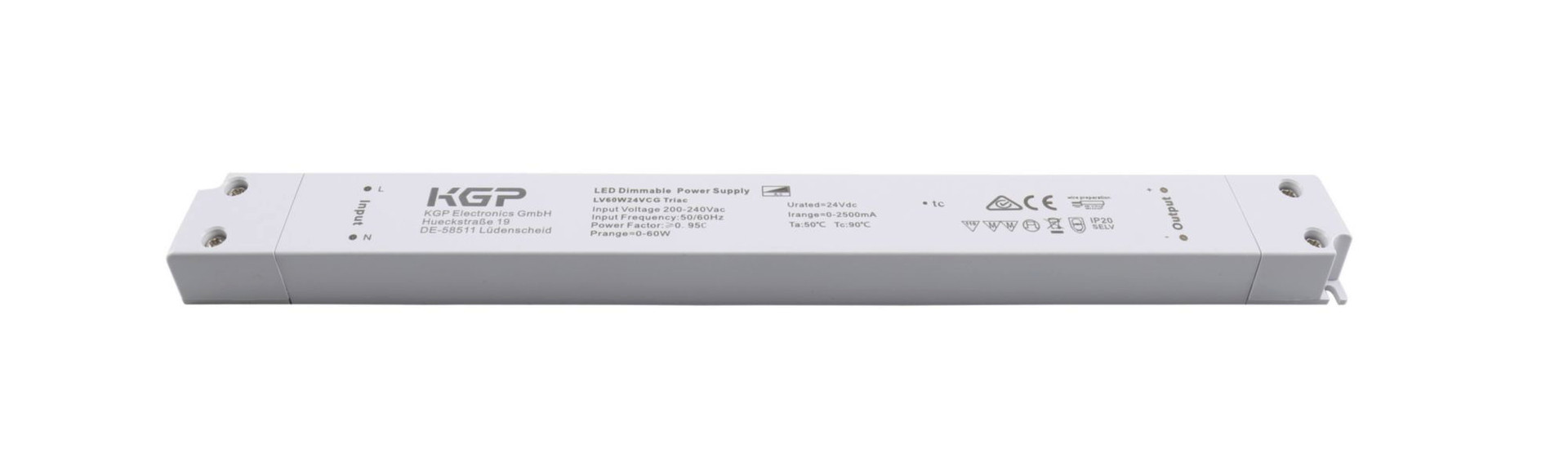 | Kurzbeschreibung | KGP, Netzgerät (CV, DC) dimmbar, KGP, Long-Flat, DIM, CV, LV60W24CG Triac, Spann |
