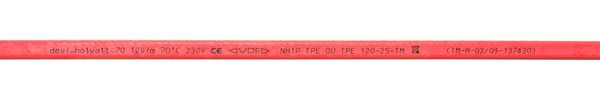 DEVI hotwatt 70, Rohrbegleitheizung zur Temperaturerhaltung an Brauchwasserleitungen mit Selbstlimitierenden Heizband den Heizband, bestehend aus 2 parallelen verzinnten Kupferlitzen und einem dazwischenliegenden Kunststoffheizelement, Schutzisolation aus Polyolefin, mit Schutzgeflecht aus verzinnter Kupferlitze und äußerem Schutzmantel aus Polyolefin.Nennspannung: 220/240 V, Haltetemperatur: 70°C, Spez. Heizleistung: 10 W/m, Max. zulässige Umgebungstemperatur: Eingeschaltet 80°C / Ausgeschaltet 100°C, Meterware