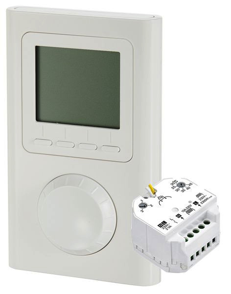 Funkthermostat mit Display und Unterputz-Funkempfänger für die Ansteuerung elektrischer Fußbodenheizmatten oder anderer Verbraucher mit Festanschluss. Anhand der Abweichung von Raum- oder Bodentemperatur zur Solltemperatur wird mittels Funksignal der Empfänger angesteuert, der dann über den Schaltkontakt den Verbraucher ein- oder ausschaltet. Die Spannungsversorgung für den Funkempfänger ist in der Unterputzdose bauseits vorzusehen. Durch die kabellose Signalübertragung kann der Raumthermostat, wandmontiert oder mittels beiliegendem Standfuß, beliebig im Raum platziert werden.