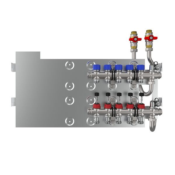 Verteiler aus Edelstahl 1.4301 zur Erweiterung der Trinkwassererwärmungsmodule auf wahlweise 4 bis max. 9 Heiz- oder Kühlkreise für Vor- und Rücklauf. Alle Verteil- und Anschlusskomponenten auf einem Blech vormontiert, dadurch einfacher Anschluss und Einbau in das Schrankmodul (UPG L / APG L) möglich. Verteilerbalken bestehend aus: Durchflussanzeiger 0-3 l/min im Vorlaufverteiler zum hydraulischen Abgleich jedes einzelnen Heizkreises, Absperr- und regulierbarer Durchfluss für jeden Wand- oder Fußbodenheizungskreis im Rücklaufverteiler mit Thermostatventileinsätzen M30x1,5 für die Aufnahme von Stell- bzw. Regelantrieben, Spül-, Füll-, Entleerungsventile und Absperrkugelhähne G ¾“ AG im Vor- und Rücklauf, schallentkoppelte Montage auf dem Grundblech mit gummierten Befestigungsschellen. Anschlussnennweite Heiz- bzw. Kühlkreise G ¾“AG, max. Betriebsdruck 4 bar.