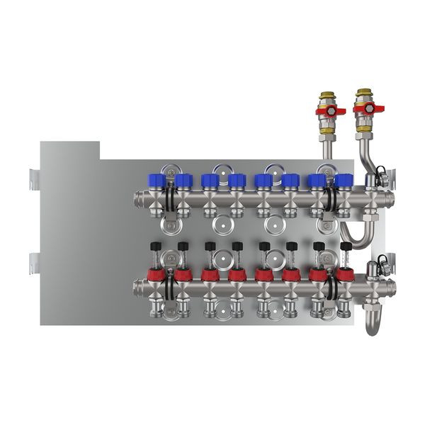 Verteiler aus Edelstahl 1.4301 zur Erweiterung der Trinkwassererwärmungsmodule auf wahlweise 4 bis max. 9 Heiz- oder Kühlkreise für Vor- und Rücklauf. Alle Verteil- und Anschlusskomponenten auf einem Blech vormontiert, dadurch einfacher Anschluss und Einbau in das Schrankmodul (UPG L / APG L) möglich. Verteilerbalken bestehend aus: Durchflussanzeiger 0-3 l/min im Vorlaufverteiler zum hydraulischen Abgleich jedes einzelnen Heizkreises, Absperr- und regulierbarer Durchfluss für jeden Wand- oder Fußbodenheizungskreis im Rücklaufverteiler mit Thermostatventileinsätzen M30x1,5 für die Aufnahme von Stell- bzw. Regelantrieben, Spül-, Füll-, Entleerungsventile und Absperrkugelhähne G ¾“ AG im Vor- und Rücklauf, schallentkoppelte Montage auf dem Grundblech mit gummierten Befestigungsschellen. Anschlussnennweite Heiz- bzw. Kühlkreise G ¾“AG, max. Betriebsdruck 4 bar.