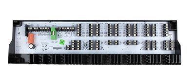 Elektrischer Verteiler zum Einbau in die Wohnungsstation. Verteilung der Spannungsversorgung, der Stellsignale und eines gemeinsamen Zeitprogramms für Raumgeräte (analog oder mit Display) und thermische Antriebe. • Zur einfachen Verkabelung von bis zu 10 Heizkreisen • Weiterleitung von Schaltsignalen der Einzelraumregler für Heizen oder Heizen/Kühlen • Individuelle Weitergabe von Zeitbefehlen oder Nachtabsenkung an entsprechende Stellantriebe, max. 2 Zeitkanäle • Pumpen- und Kesselsteuerung • Pumpenlogik mit einstellbarer Nachlaufzeit zur Ansteuerung der Umwälzpumpe • Integrierte Ventilschutzfunktion • Eingang für einen Temperaturbegrenzer oder Taupunktwächter • Statusanzeige mittels LEDs • Umschaltung der Pumpensteuerung für NC/NO-Antriebe • Zum Anschluss von max. 18 Stellantrieben • Kabelführung, normkonforme Zugentlastung und schraublose Klemmenanschlusstechnik Abmessungen: B x H X T: 327 x 90 x 52 mm