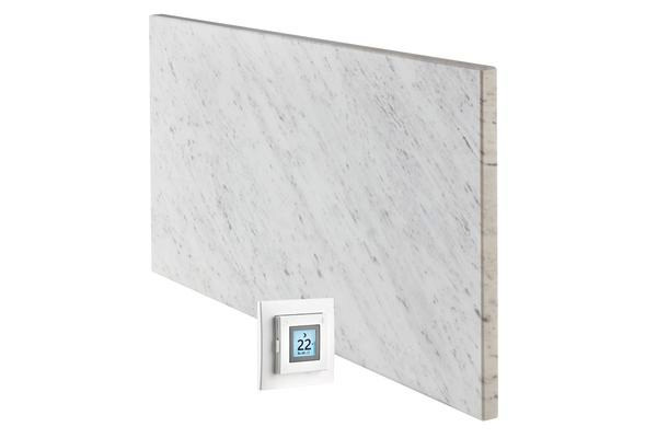 Natursteinheizung zur horizontalen oder vertikalen Wandmontage mittels mitgeliefertem Montagesatz, Kernbeheizung durch im Stein eingelassene Heizleitungen, besondere Leitungsführung für besonders gleichmäßige Oberflächentemperatur, zweifacher Übertemperaturschutz, Anschlussleitung für Festanschluss ca. 1,3 m. Im Set mit Raumtemperaturregler DTB 2R Einfach zu bedienende Regelung. Mit vielen Features zum Energiesparen und Einsatz im Bestand. Elektronischer, universal einsetzbarer Boden- und Raumthermostat (2-Punkt) mit Funkempfänger für Smart Climate System. Durch die benutzerfreundliche Oberfläche und das moderne Design passt der Thermostat in jede Umgebung und erfüllt die meisten Nutzungs- und Designvorlieben. Verfügt über integriertes Wochenprogram und einen sehr genauen Thermostat mit Standby-Stromverbrauch von weniger als 0,5 Watt. Ein einfaches Setup-Menü hilft bei allen Einstellungen. Hochauflösendes Farbdisplay mit Hintergrundfarbe als Statusanzeige: Rot für die Komforttemperatur, Grün für die Absenktemperatur und Blau für die Betriebsart Frostschutz. In Unterputzausführung für Elektro- oder Warmwasserheizsysteme (stromlos geschlossene Stellantriebe). Softwareseitige Umschaltmöglichkeit zur Verwendung als Raumtemperaturregler oder als Raumtemperaturregler mit Bodentemperaturbegrenzer. Schaltleistung ~230 V / 16 A, Temperatureinstellbereich Raum 7 - 40 °C, Boden fest 27°C, Einstellung in 1 K-Schritten. Fühler im Lieferumfang enthalten. Farbe weiß.