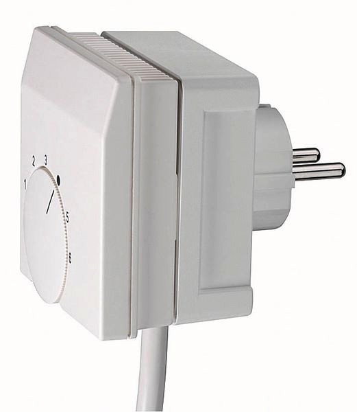 Steckerthermostat (Bimetall) zum Einstecken in Steckdose, Regelbereich 5 °C bis 30 °C, im Gehäusedeckel integrierte Temperaturbereichs-Einengung, Schaltleistung AC 250V / 13 (4) A, max. 3000 W, Farbe: alpinweiß