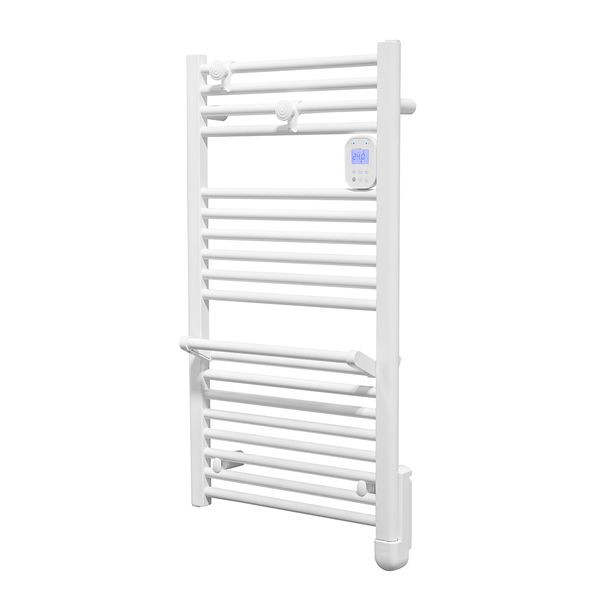 Handtuchtrockner mit Wasser-Glycol-Gemisch zur besseren Wärmeverteilung. Handtuchhalter zum heraus klappen, sowie zwei versetzbaren Hacken. Mit integrierter Regelung, wählbares Wochenprogramm und Boost-Funktion für eine effiziente und bedarfsgerechte Einstellung der Heiz- und Absenkzeiten. Energieeinsparfunktion durch permanente Kontrolle der Raumtemperatur (Erkennung offenes Fenster) und entsprechende Anpassung der Heizfunktion (EIN/Frostschutz). Anschlussleitung mit Festanschluss von unten rechts, ca. 1,5m