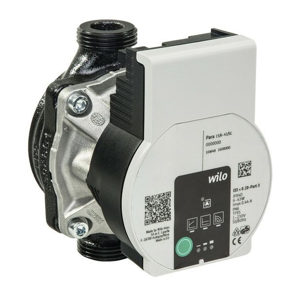 Hocheffizienz Nassläuferpumpe für den Einsatz in Wärmepumpensystemen, insbesondere im Verbraucherkreis (Heizen und Kühlen) sowie im Solekreislauf durch Kataphorese-Beschichtung und fest hinterlegten Drehzahlstufen. Regelungsarten zur optimalen Lastanpassung über Bedienknopf vorwählbar: feste Drehzahlstufen (I, II; III) und Differenzdruckregelung konstant (?p-c) 3-stufig, optional Ansteuerung mittels externem Eingangssignal möglich (Signalkabel nicht im Lieferumfang). Entlüftungsfunktion vorhanden. Förderhöhe max. 8,4 m bei einem Durchsatz von 1,1 m3/h, Volumenstrom max. 3,5 m3/h mit einer Förderhöhe von 2,2 m; Max. Druckstufe PN 10; Energieeffizienz EEI ? 0,21. Stichmaß 180 mm; Anschlussspannung: 1/N/PE ~230 V, 50 Hz. Abmessungen: H x T x B: 180 x 138 x 94 mm. Anschlusskabel Last 1,5 m und Dichtungen (2x) im Lieferumfang.