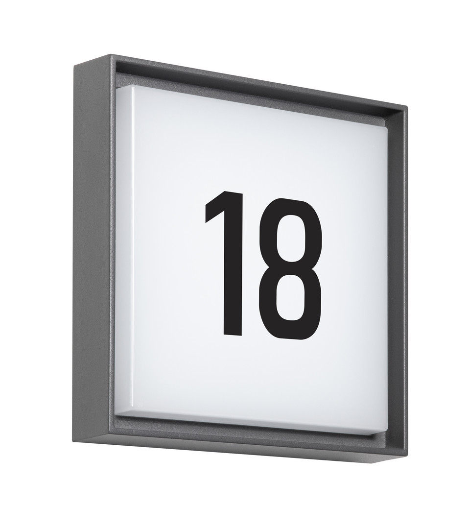 Hochwertiges Aluminiumgehäuse mit Pulverbeschichtung in RAL7016 Robustes, strahlwassergeschütztes Design für den Außenbereich mit IP 65 Schutz Blendfreie, homogene und schattenfreie Lichtverteilung EasyBase-Plattform ermöglich einfache und schnelle Montage mit Dämmerungsschalter inklusive Montagezubehör Insektenfreundliche Beleuchtung durch warmweiße LED Gehäusefarbe ähnlich RAL 7016 Bestellen Sie separat das Hausnummernset 4751: Dieses beinhaltet 3 Zahlensätze (0 - 9) und jeweils einen Buchstabensatz in Groß- (A - H) und Kleinbuchstaben (a - h) mit einer Buchstabenhöhe von 8,5 cm
