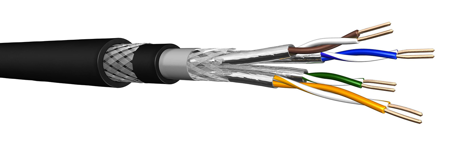 Doppelt geschirmtes Datenkabel (Jeder Paar mit Folie, darüber verzinntes CU-Geflecht als Gesamtschirm) für den Einsatz in anwendungsneutraler Gebäudeverkabelung nach ISO/IEC11801 und EN50173, wie auch in rauer Umgebung. Dieses Datenkabel hat über dem klassischen Aderaufbau ein längslaufendes Aluminiumband welches mit einem halogenfreien LSHF-Zwischenmantel versiegelt ist, und zusätzlich darüber als Armierung (Nagetierschutz) noch verzinktes Stahldrahtgeflecht ehe der abschließende Außenmantel aus Polyethylen (PE) dieses Kabel auch für sehr raue Umgebungen einsetzbar macht.
