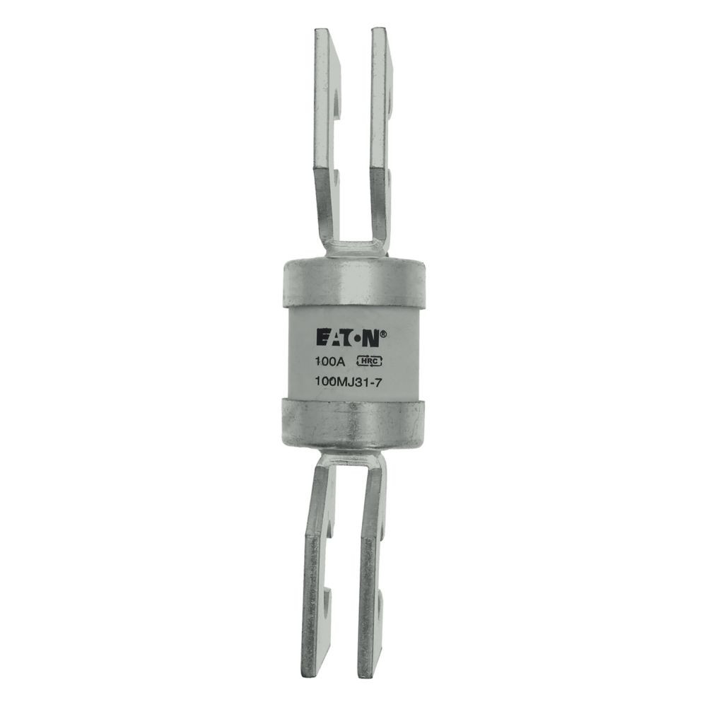 Sicherung, Nennstrom 100 A, Spannungswert AC 415 V, BS88/J, 31 x 131 mm, gU, BS, doppelte verschraubte Anschlussfahnen (geschlitzt), 92 mm Stichmaß, Zuleitungssäulen, BS88-2, IEC 60269-2, Ausschaltvermögen 80 kA, Optionale Zusatzausrüstung Sicherungshalter JW4