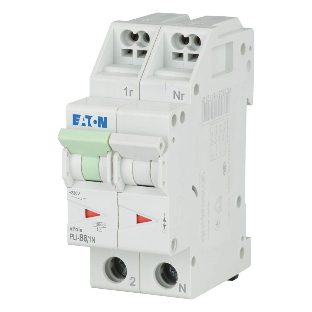 Leitungsschutzschalter, PLI, 1-polig + N, Auslösecharakteristik: B, Bemessungsstrom Ein: 8 A, Bemessungsschaltvermögen nach IEC/EN 60898-1: 10 kA, Schaltgeräte für den Wohnungsbereich und kommerzielle Anwendungen