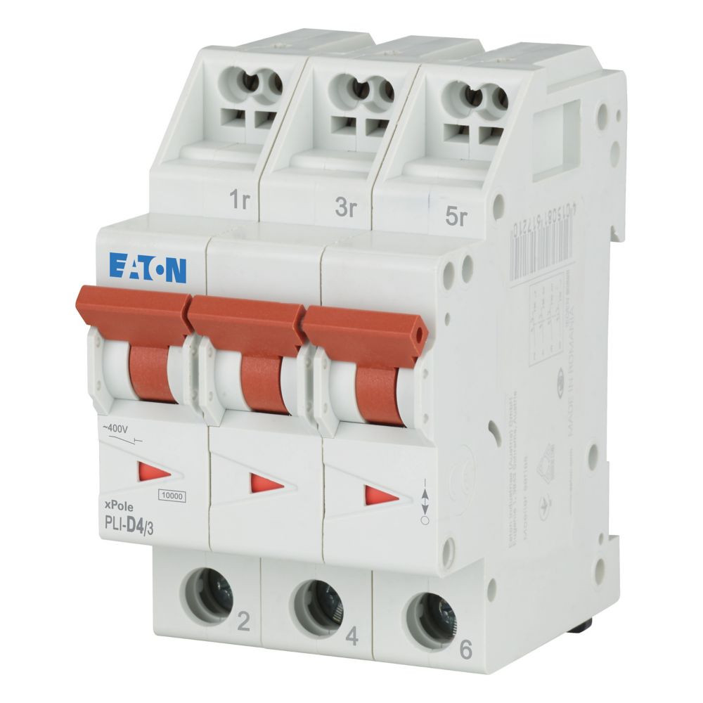 Leitungsschutzschalter, PLI, 3-polig, Auslösecharakteristik: D, Bemessungsstrom Ein: 4 A, Bemessungsschaltvermögen nach IEC/EN 60898-1: 10 kA, Schaltgeräte für den Wohnungsbereich und kommerzielle Anwendungen