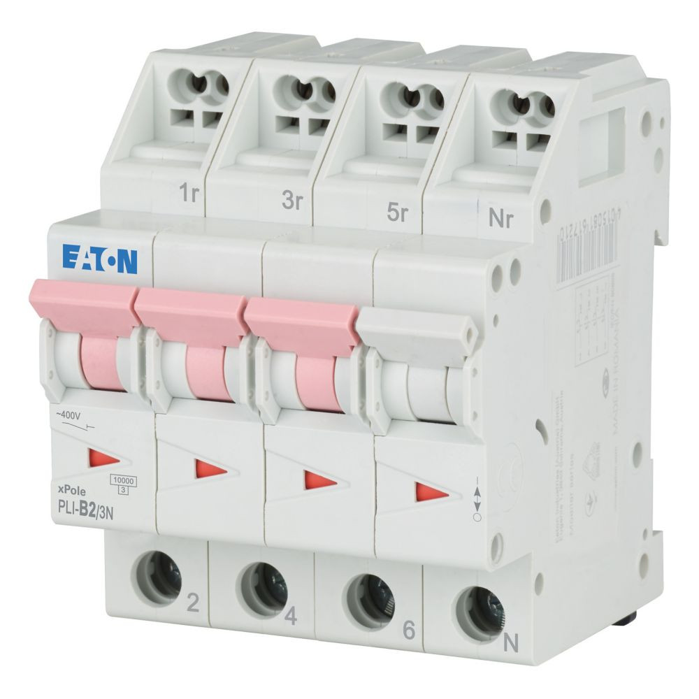 Leitungsschutzschalter, PLI, 3-polig + N, Auslösecharakteristik: B, Bemessungsstrom Ein: 2 A, Bemessungsschaltvermögen nach IEC/EN 60898-1: 10 kA, Schaltgeräte für den Wohnungsbereich und kommerzielle Anwendungen