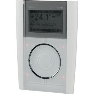 Der Room-Manager ist ein zentrales Anzeige- und Bediengerät, welches vorgegebene und ausgetestete Applikationen einer moderenen Elektroinstallation wie z.B.: Einzelraumheizung und Kühlung, Lüftung, Zeitfunktionen, Beschattung, Sicherheit usw. bietet. Der Room-Manager kommuniziert mit allen Geräten des Eaton-RF-Systems. Modernste Tastsensortechnologie ermöglicht eine einfache vor Ort Bedienung und Einstellung sämtlicher Paramerter (z.B.: Zeitprogramm, Temperatur, usw.) für den Nutzer. Das hintergrundbeleuchtete Grafikdisplay garantiert einfache und prägnate Darstellung der wichtigsten Infomationen für den Endkunden. Die Installation erfolgt Aufputz, alternativ kann das Gerät an einer 55mm oder 68mm Schalter-, Abzweig- oder Installationsdose befestigt werden. Zum Systemupdate oder zur Funktionserweiterungen wird die integrierte IR-Schnittstelle verwendet. Bei den Room-Manager CRMA-00/11 bis CRMA-00/18 haben Sie zusätzlich die Möglichkeit, über das im Room-Manager integrierte Bluetooth-Modul mit einem Bluetooth-fähigem Mobiltelefon Daten auszutauschen. Somit können SMS-Nachrichten bei einem Ereignis vom Room-Manager abesetzt werden, oder durch ein SMS von außen ein Gerät über den Room-Manager geschaltet werden. Die Versorgung erfolgt über das Netz.