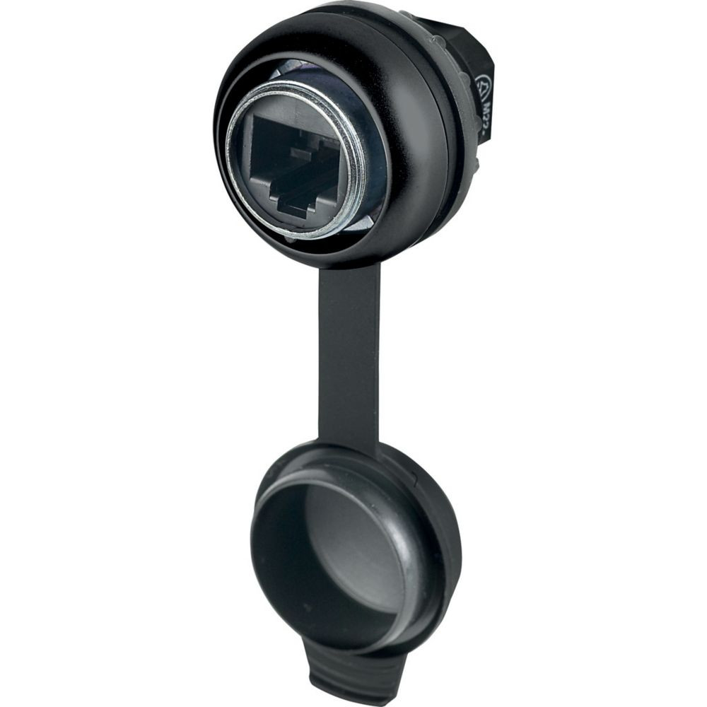 Einbaubuchse, Allgemeines Zubehör, Buchse RJ45, 8/8, cat. 5e, Schutzart: IP65 (mit geschlossener Abdeckung), IP20 (mit Stecker in gestecktem Zustand), Frontring Schwarz, Anbindung an SmartWire-DT: nein, verwendbar für: Frontmontage, Anzahl der Pole: 8 Pole