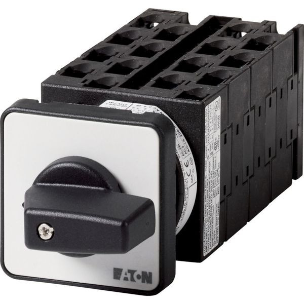 Stufenschalter, Sortiment: Steuerschalter, Normen und Bestimmungen: IEC/EN 60947, VDE 0660, IEC/EN 60204, CSA, UL, Lasttrennschalter nach IEC/EN 60947-3, Typkenner: T0, mit schwarzem Knebel und Frontschild, Kontakte: 16, Schutzart: Front IP65, Bauform: Einbau, Schaltwinkel: 45 °, Schaltverhalten: rastend, mit 0-Stellung, 8 Baueinheit(en), Bemessungsdauerstrom: Iu= 20 A, Frontschild: 0-8