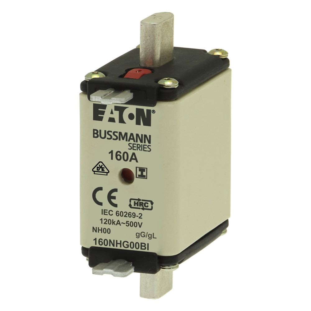 Sicherung, Sicherungseinsatz, Niederspannung, 160 A, AC 500 V, NH00, gL/gG, IEC, Kombi-Kennmeldersystem, quadratischer Körper mit Messerkontakten, isolierte Grifflaschen, IEC 60269-2 Sicherungssystem A, DIN 43620, VDE 0636-2, Ausschaltvermögen 120 kA