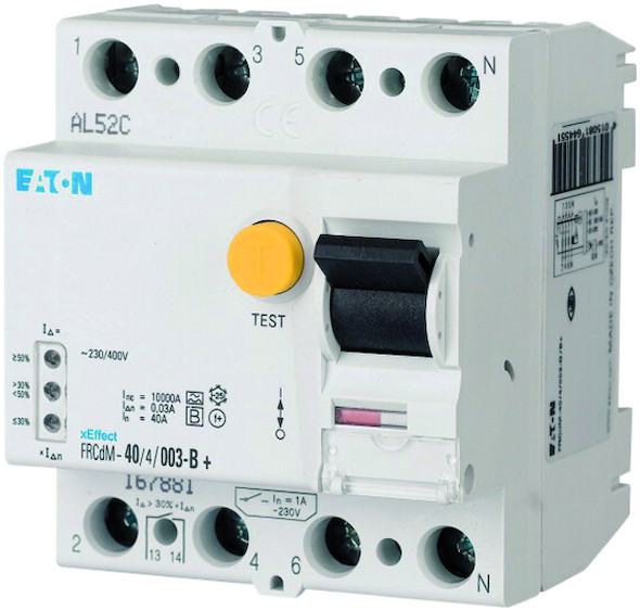 Fehlerstrom-Schutzschalter FRCdM, 4-polig, Bemessungsstrom Ein: 25 A, Bemessungskurzschlussfestigkeit Icn: 10 kA mit Vorsicherung kA, Bemessungsfehlerstrom I?N: 0,3 A, Fehlerstrom-Schutzschalter – frequenzumrichterfest