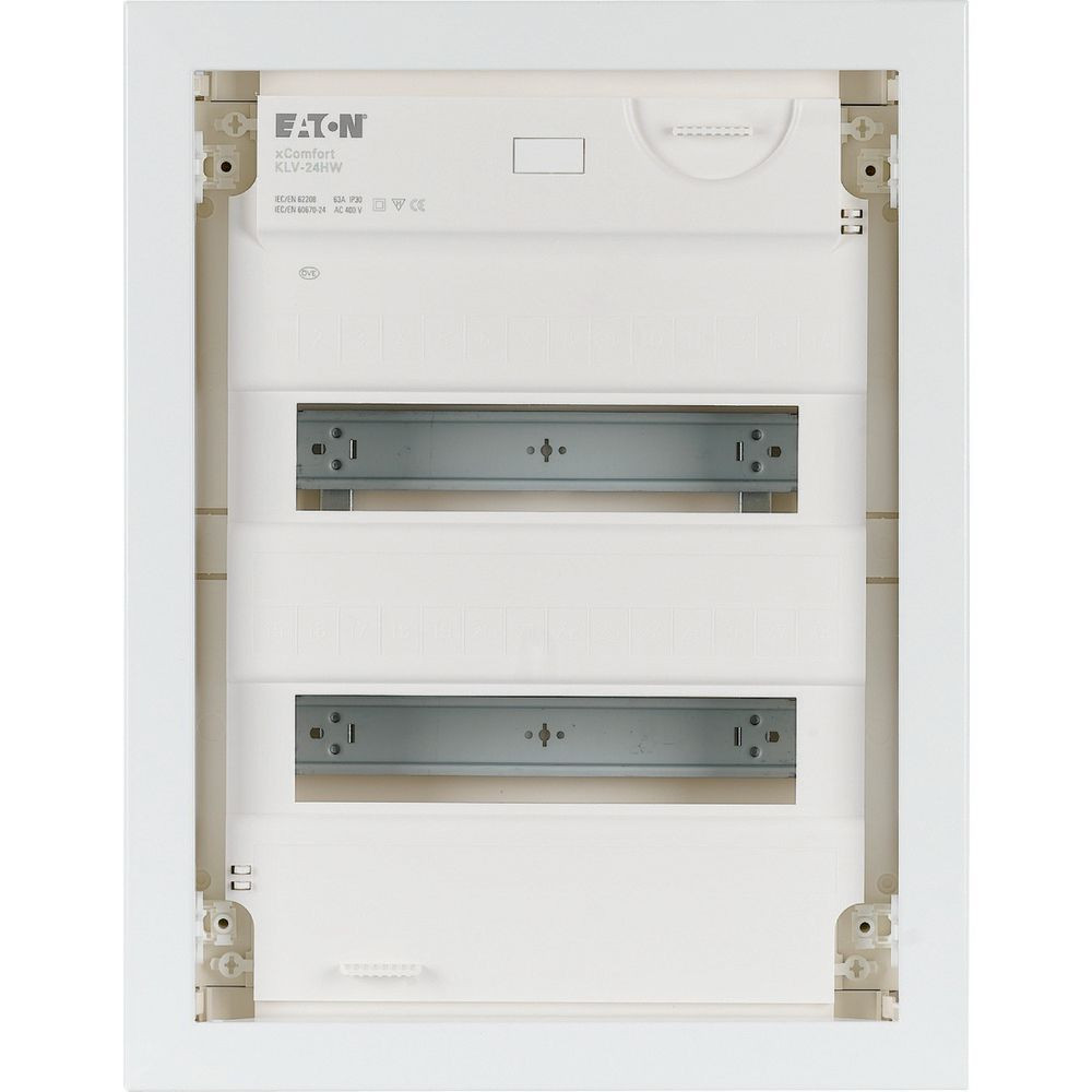 Hohlwand-Kleinverteiler KLV der zweiten Generation, Schutzklasse II, Kunststoffgehäuse mit Stahlblechtür, Frontabdeckung, plombierbar und laserbeschriftet entsprechend IEC/EN 60670-24, plus 2 Teilungseinheiten Reserve je Reihe, Beschriftungsfeld in Wandkasten, flaches Türrahmen-Design, robuster Türdrehriegel, optional ersetzbar mit Sicherheitsverriegelung, Kabelhalter für saubere Verkabelung, optional in Lieferumfang für Projekte erhältlich, optionale Tür mit Rahmen in RAL-Wunschfarbe, umfangreiches Zubehör, im Lieferumfang enthalten: Gehäuse, Geräteträger, Frontabdeckung