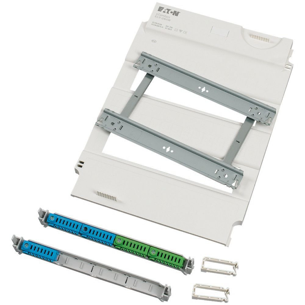 Lieferumfang für Projekte: Interieur-Hohlwand-Ausbausatz für Kleinverteiler KLV der zweiten Generation, im Lieferumfang enthalten: Gerätehalter, Frontabdeckung, Null- und Schutzleiterklemmen mit KSK Steck-Klemmtechnik, Kabelbinder, Montageanleitung, Beschriftungsbogen. Normen: Vollständiger Stromverteiler gemäß IEC/EN 60670-24, DIN 43871, IEC/EN 62208 und, entsprechend, zugelassen für Stromverteiler gemäß der Definition in IEC/EN 61439-3.