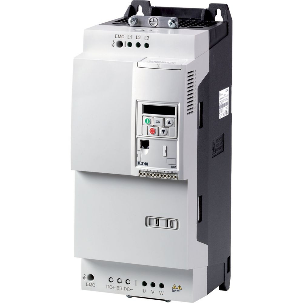 Frequenzumrichter, Typkenner (z. B. DIL): DC1, Bemessungsbetriebsspannung: Ue = 230 V AC, 3-phasig, 240 V AC, 3-phasig, Ausgangsspannung bei Ue: U2 = 230 V AC, 3-phasig, 240 V AC, 3-phasig, Netzspannung (50/60Hz): ULN = 200 (-10%) - 240 (+10%) V, Bemessungsbetriebsstrom bei 150% Überlast: Ie = 46 A, Hinweis: Bemessungsbetriebsstrom bei einer Schalthäufigkeit von 16 kHz und einer Umgebungstemperatur von +50 °C, Hinweis: Überlastzyklus für 60 s alle 600 s, Zugeordnete Bemessungsbetriebsleistung Hinweis: für normal, intern und extern belüftet, 4-polig, Drehstrom-Asynchronmotoren mit 1500 U/min –1 bei 50 Hz oder 1800 min –1 bei 60 Hz