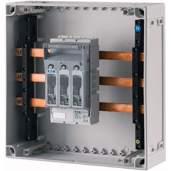 NH-Verteilerschrank mit transparentem Deckel, 1x Schaltanlage NH00 auf Sammelschienensystem 250 A, 3-polig, Träger inklusive für N+PE zum Nachrüsten, mit Kupferschienen L1/L2/L3: 20 x 5 mm, N: ohne, PE: ohne, ohne Klemmen