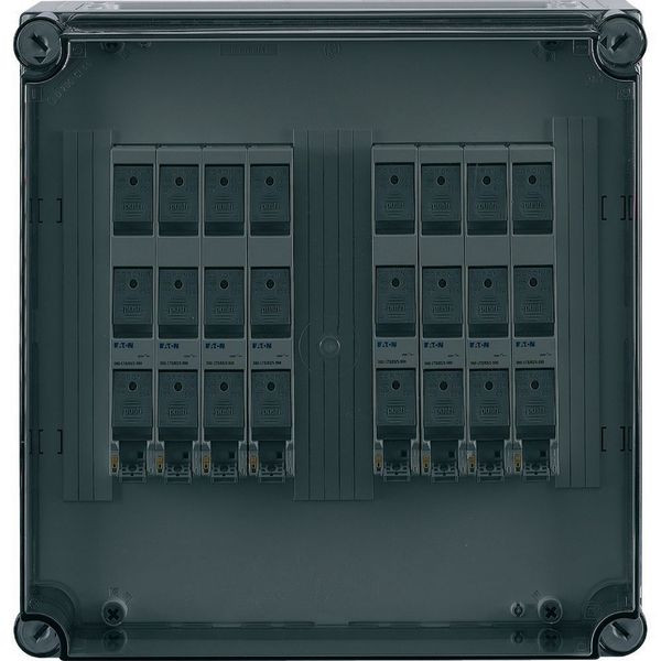 D02 Verteilerschrank mit transparentem Deckel, 8x D02 Lasttrennschalter auf Sammelschienensystem 400 A, 3-polig, Träger inklusive für N+PE zum Nachrüsten, mit Kupferschienen L1/L2/L3: 20 x 10 mm, N: ohne, PE: ohne, ohne Klemmen, Sicherungsgerät mit Schubladen und Blinkfunktion, ohne Schmelzsicherungen.