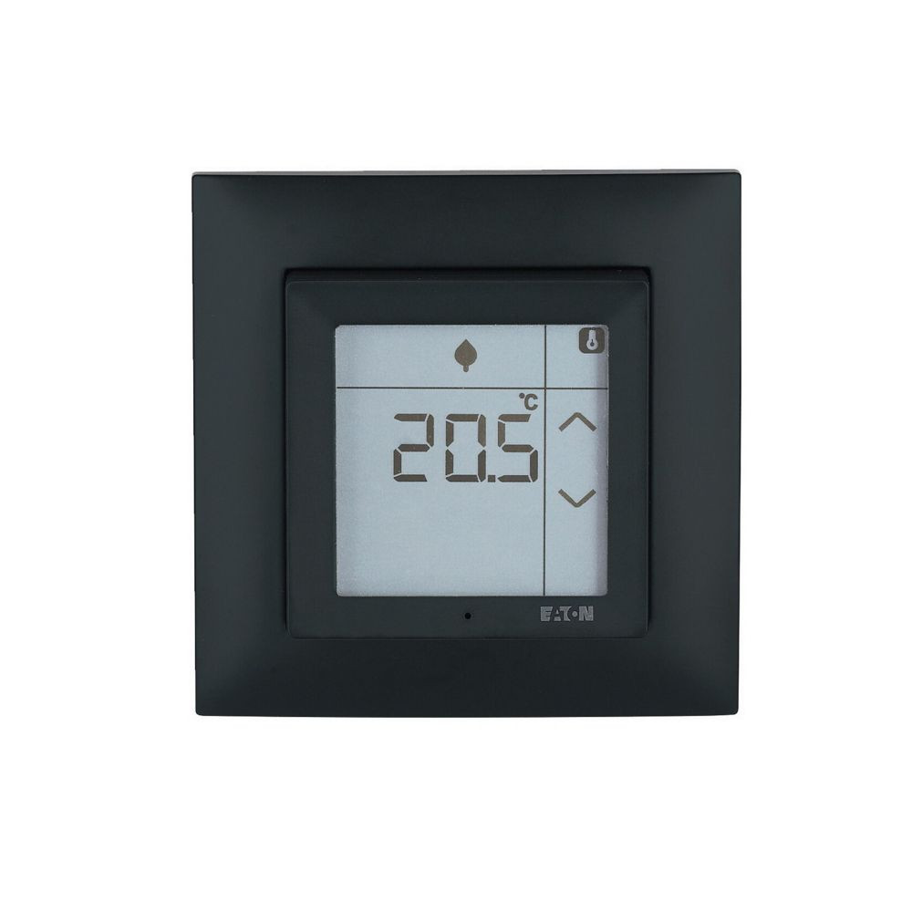 Raumcontroller Touch komplett mit Rahmen, tiefschwarz matt, und eignet sich dank des Temperatur- und Feuchtigkeitssensors zur Überwachung und Steuerung des Raumklimas, entweder alleine oder zusammen mit einem intelligenten Gerät. Die Bedienung erfolgt durch das Touch-Display mit Hintergrundbeleuchtung. Der benutzerprogrammierbare Wochen-Programm-Timer und 4 Betriebsarten bieten ein Höchstmaß an Flexibilität, um die spezifischen Bedürfnisse zu erfüllen. Die Bodentemperaturregelung wird über einen optionalen externen verdrahteten Bodentemperaturfühler (PT1000) unterstützt. Zwei optionale Touch-Tasten auf dem Display stehen für die Steuerung anderer xComfort Funktionen / Aktoren zur Verfügung