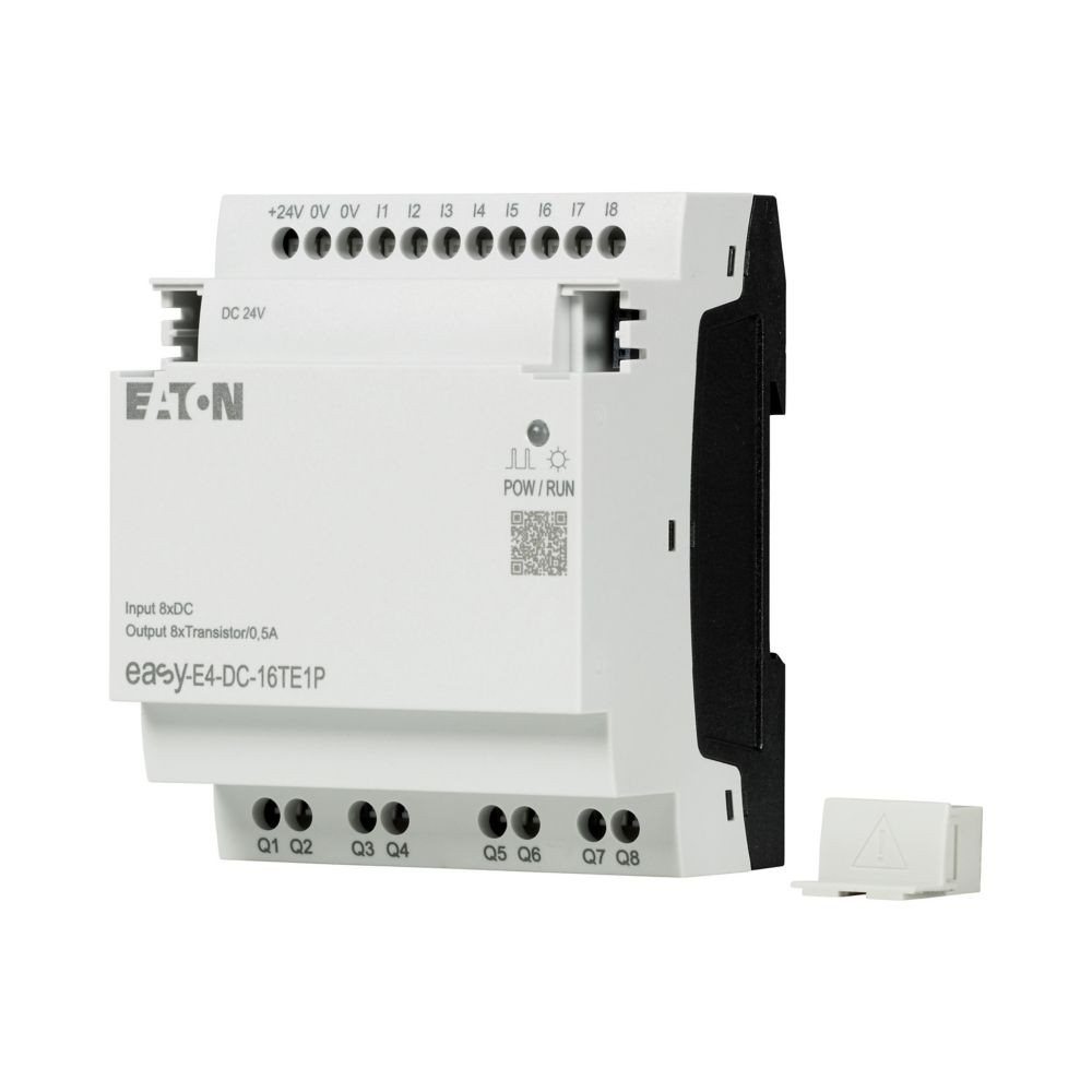 E/A-Erweiterung für Steuerrelais der easyE4-Serie mit einer Nennbetriebsspannung von 24 V DC. Diese Erweiterung bietet 8 Digitaleingänge für 24 VDC und 8 Transistorausgänge für 24 VDC. Die Verbindungen werden über Push-In-Klemmen hergestellt. Der Anschluss an das Steuerrelais oder jede andere Erweiterung der easyE4-Serie erfolgt über den EASY-E4-CONNECT1-Steckverbinder (Artikel 197225), serienmäßig enthalten.