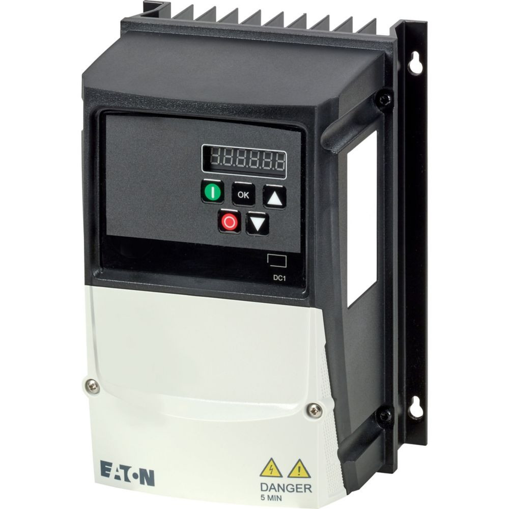 Frequenzumrichter, Typkenner (z. B. DIL): DC1, Bemessungsbetriebsspannung: Ue = 230 V AC, 1-phasig, 240 V AC, 1-phasig, Ausgangsspannung bei Ue: U2 = 230 V AC, 3-phasig, 240 V AC, 3-phasig, Netzspannung (50/60Hz): ULN = 200 (-10%) - 240 (+10%) V, Bemessungsbetriebsstrom bei 150% Überlast: Ie = 2,3 A, Hinweis: Bemessungsbetriebsstrom bei einer Schalthäufigkeit von 6 kHz und einer Umgebungstemperatur von +40 °C, Hinweis: Überlastzyklus für 60 s alle 600 s, Zugeordnete Bemessungsbetriebsleistung Hinweis: Für normale, intern und extern belüftete, vierpolige Drehstrom-Asynchronmotoren mit 1500 U/Min bei 50 Hz und 1800 U/Min bei 60 Hz