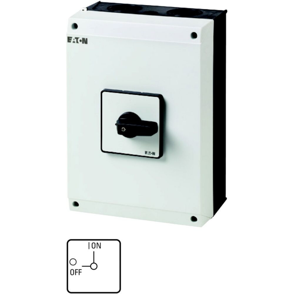 EIN-AUS-Schalter, Sortiment: EIN-AUS-Schalter, Typkenner: T5, mit schwarzem Knebel und Frontschild, 2-polig, Schutzart: IP65, Bauform: Oberflächenmontage, Schaltwinkel: 90 °, Schaltverhalten: rastend, Frontschild: 0-1, Bemessungsbetriebsleistung AC-23A, 50 - 60 Hz 400 V: P = 55 kW, Bemessungsdauerstrom: Iu = 100 A, 1 Baueinheit(en), Normen und Bestimmungen: IEC/EN 60947, VDE 0660, IEC/EN 60204, Lasttrennschalter nach IEC/EN 60947-3