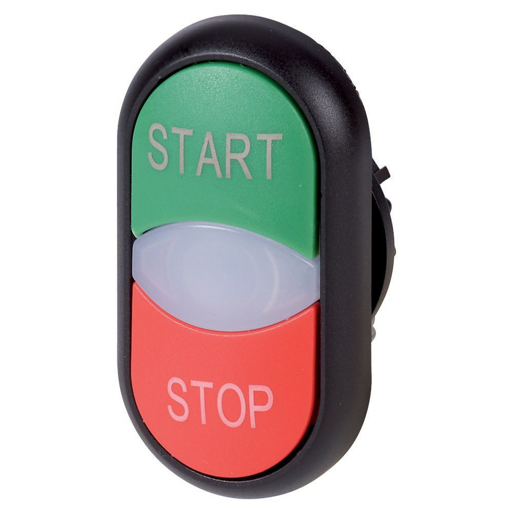| Kurzbeschreibung | Double actuator pushbutton, +indicator light, white , white, off switch raised black, facility for inscription |