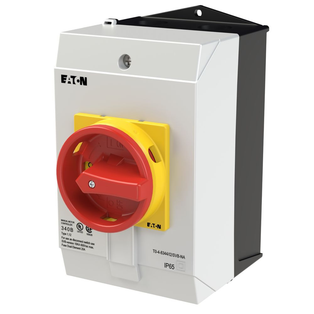 Hauptschalter, Sortiment: Hauptschalter, Wartungsschalter, Reparaturschalter, Typkenner: T0, Stopp-Funktion: NOT-AUS-Funktion, mit rotem Drehgriff und gelbem Sperrkranz, Hinweise: UL/CSA, 8-polig, Schutzart: IP65, Bauform: Oberflächenmontage, Schaltwinkel: 90 °, Bemessungsbetriebsleistung AC-23 A, 50 bis 60 Hz 400 V: P = 5,5 kW, Bemessungsdauerstrom: Iu = 20 A, 4 Baueinheit(en), Normen und Bestimmungen: IEC/EN 60947, VDE 0660, IEC/EN 60204, CSA, UL, Lasttrennschalter nach IEC/EN 60947-3
