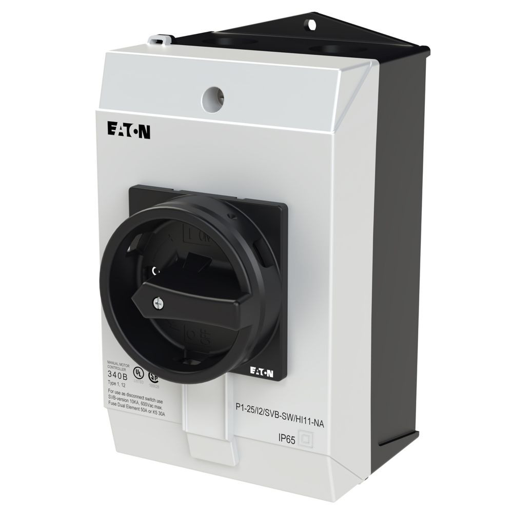 Hauptschalter, P1, Bemessungsdauerstrom (Iu): 25 A, Funktionen: Verriegelbar, HALT-Funktion, Ausstattung: Schwarzer Drehgriff und Sicherungsring, Montageart: Aufputzmontage, Polzahl: 3-polig, Schutzart: NEMA 12