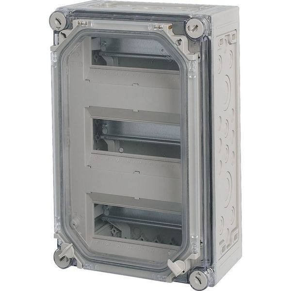 Automaten-Einzelgehäuse mit Tür, Material Polycarbonat, schlagfest, Schutzart IP65, metrische Vorprägungen für Kabelführungen an allen Seiten, zur Montage von Geräten mit einer Baugröße 1 nach DIN 43880, Transparenter Deckel rauchgrau mit Schnellverschlüssen, transparente Tür rauchgrau für Bedienerzugang zu Geräten, Tragschienen zum Aufschnappen der Geräte, Leerplatzabdeckung für unbenutzte Einbaustellen, Berührungsschutzabdeckung mit Beschriftungsstreifen, einschließlich Teilungseinheiten/N-Schienen, Befestigungsbänder zur Wandbefestigung, plombierbare Deckelverschlüsse, Anzahl der Teilungseinheiten = 27