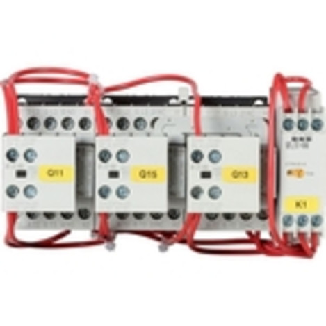 Stern-Dreieck-Schützkombination, Anwendung: Stern-Dreieck Motorstart für Schützkombinationen, Betriebsfrequenz: maximal 10 Anläufe pro Stunde, Gebrauchskategorie: NAC-3: Käfigläufermotoren: anlassen, während Betrieb ausschalten, Bemessungsbetriebsstrom AC-3, 380 V, 400 V: Ie= 12 A, Max. Bemessung für Drehstrommotoren, 50 - 60 Hz AC-3 220 V 230 V: P= 3 kW, 380 V 400 V: P= 5,5 kW, 500 V: P= 5,5 kW, 660 V 690 V: P= 5,5 kW, Max. Umschaltzeit: 20 s, Betätigungsspannung: 110 V 50 Hz, 120 V 60 Hz, Stromart AC/DC: Wechselstrombetätigung, Einzelne Komponenten der Netzschützkombination Q11: DILM7-10, + DILA-XHI20