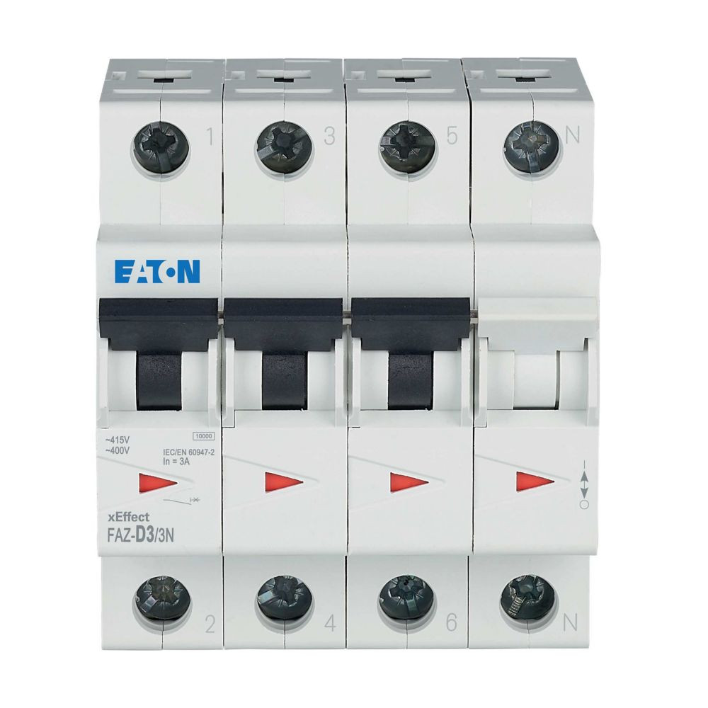 Leitungsschutzschalter (MCB), FAZ, 3-polig + N, Auslösecharakteristik: D, Bemessungsstrom Ein: 3 A, Bemessungsschaltvermögen nach IEC/EN 60947-2: 15 kA, Schaltgeräte für industrielle und erweiterte kommerzielle Anwendungen