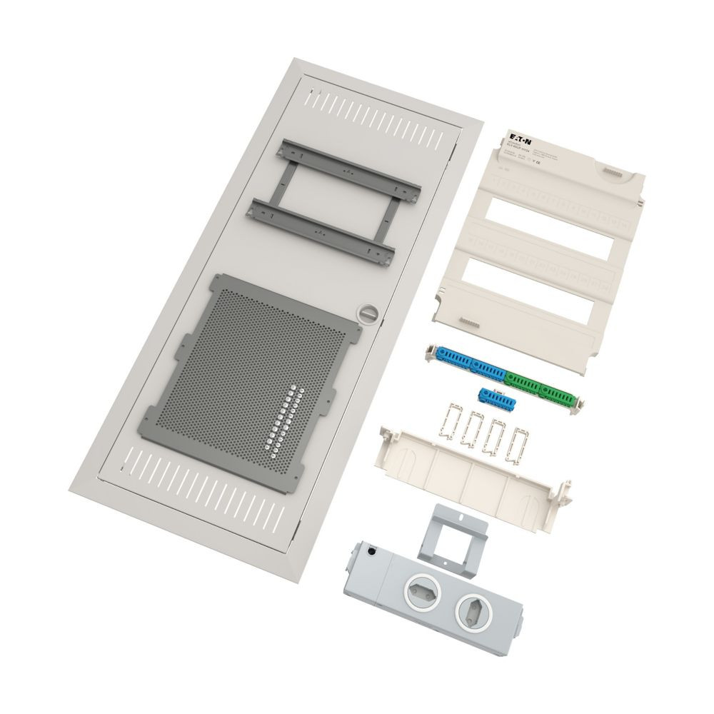 Lieferumfang für Projekte: Unterputz-Ausbausatz Hybrid Kleinverteiler KLV 5-reihig, 24MU, flaches Türrahmendesign, im Lieferumfang enthalten: Gerätehalter, Frontabdeckung, Null- und Schutzleiterklemmen mit KSK Steck-Klemmtechnik, Mikroperforierte Montageplatte, Geräteträger, Einzel-Steckdose, 3D-Putzausgleich mit bis zu 18mm Tiefenausgleich, Kabelbinder, Montageanleitung, Beschriftungsbogen. Normen: Vollständiger Stromverteiler gemäß IEC/EN 60670-24, IEC/EN 62208 und daher zugelassen für Stromverteiler gemäß der Definition in IEC/EN 61439-3.