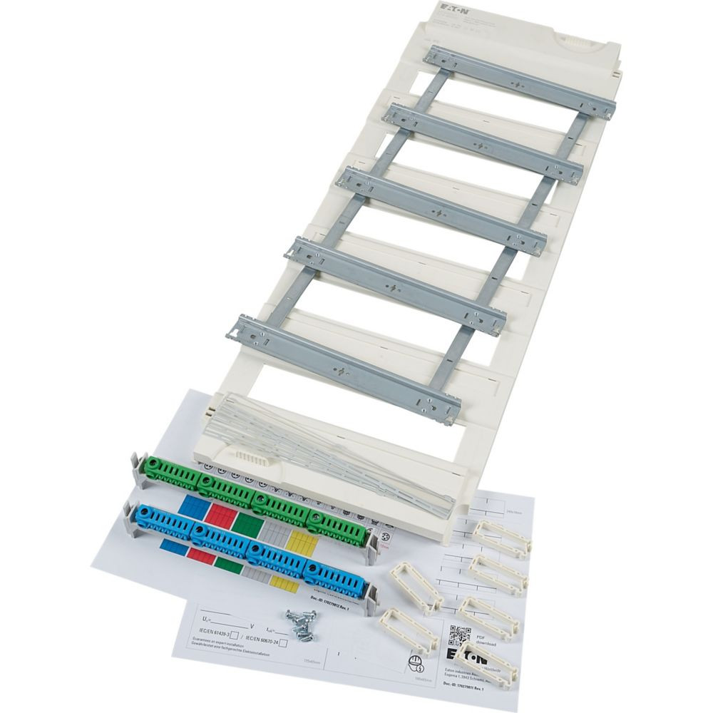 Lieferumfang für Projekte: Interieur-Hohlwand-Ausbausatz für Kleinverteiler KLV 5-reihig, im Lieferumfang enthalten: Gerätehalter, Frontabdeckung, Null- und Schutzleiterklemmen mit KSK Steck-Klemmtechnik, Kabelbinder, Montageanleitung, Beschriftungsbogen. Normen: Vollständiger Stromverteiler gemäß IEC/EN 60670-24, IEC/EN 62208 und daher zugelassen für Stromverteiler gemäß der Definition in IEC/EN 61439-3.