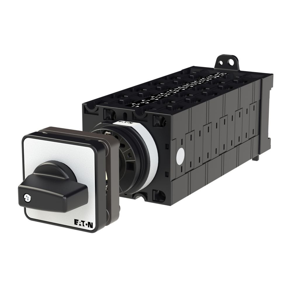 EIN-AUS-Schalter, Sortiment: EIN-AUS-Schalter, Typkenner: T3, mit schwarzem Knebel und Frontschild, 22-polig, Schutzart: Front IP65, Bauform: rückseitiger Einbau, Schaltwinkel: 90 °, Schaltverhalten: rastend, Frontschild: 0-1, Bemessungsbetriebsleistung AC-23A, 50 - 60 Hz 400 V: P = 15 kW, Bemessungsdauerstrom: Iu = 32 A, 11 Baueinheit(en), Normen und Bestimmungen: IEC/EN 60947, VDE 0660, IEC/EN 60204, CSA, UL, Lasttrennschalter nach IEC/EN 60947-3