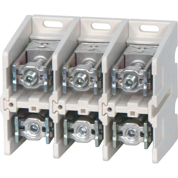 K Anschlussklemmen, für AL und CU, eine Seite rund, eine Seite flach, Bemessungsbetriebsstrom Ie = 400 A, Pole = 3, Anschlussquerschnitte: Kupfer-Rundkabel mehrdrähtig, Sektorkabel mehrdrähtig, Rundkabel eindrähtig, Sektorkabel eindrähtig, Sektorkabel eindrähtig = 1x 50 bis 240 oder 2x 25 bis 120 mm² oder Aluminium, Sektorkabel eindrähtig = 1x 95 bis 185 oder 2x 50 bis 95 mm² Andere Seite: Kupferband 6 x 16 x 0,8 bis 10 x 16 x 0,8 oder Kupferschiene = 25 x 15 mm, Hinweise: Umbausätze von Bandanschluss in Kabelanschluss separat erhältlich, Klemmenabdeckung separat verfügbar