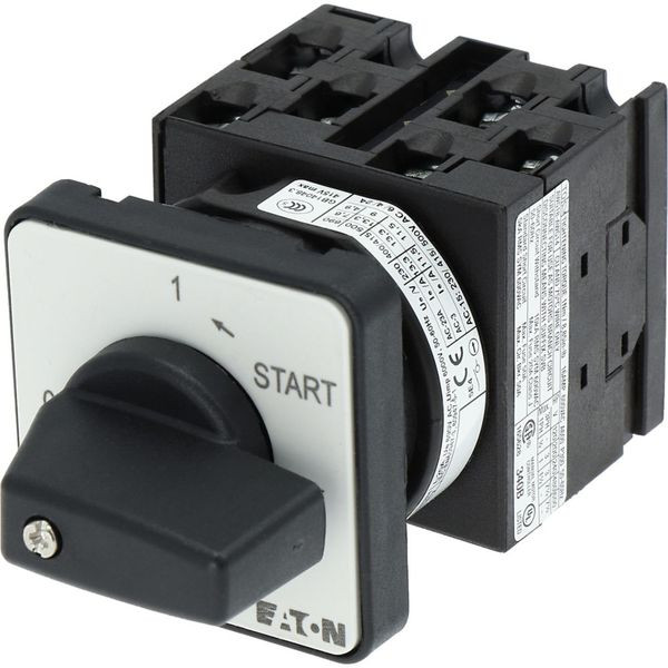 EIN-AUS-Taster, Sortiment: Steuerschalter, Normen und Bestimmungen: IEC/EN 60947, VDE 0660, IEC/EN 60204, CSA, UL, Lasttrennschalter nach IEC/EN 60947-3, Typkenner: T0, mit schwarzem Knebel und Frontschild, Kontakte: 6, Tastend: Tastfunktion in Stellung START, Schutzart: Front IP65, Bauform: Einbau, Schaltwinkel: 90 °, Schaltverhalten: rastend, mit 0-Stellung, Mit Federrückstellung auf 1, 3 Baueinheit(en), Bemessungsdauerstrom: Iu= 20 A, Frontschild: 0-1