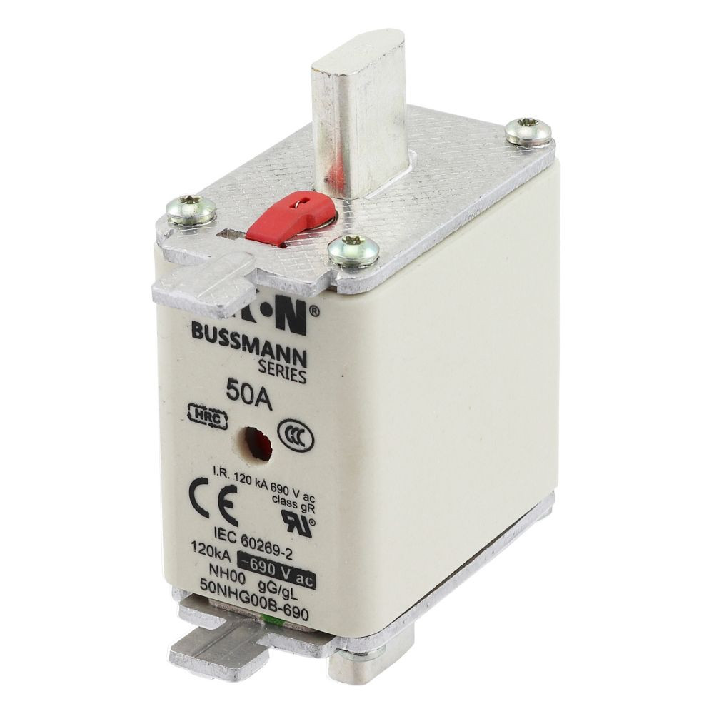 | Kurzbeschreibung | Sicherungseinsatz, Niederspannung, 50 A, AC 690 V, NH00, gL/gG, IEC, Doppelkennmelder, spannungsführende Grifflasche |