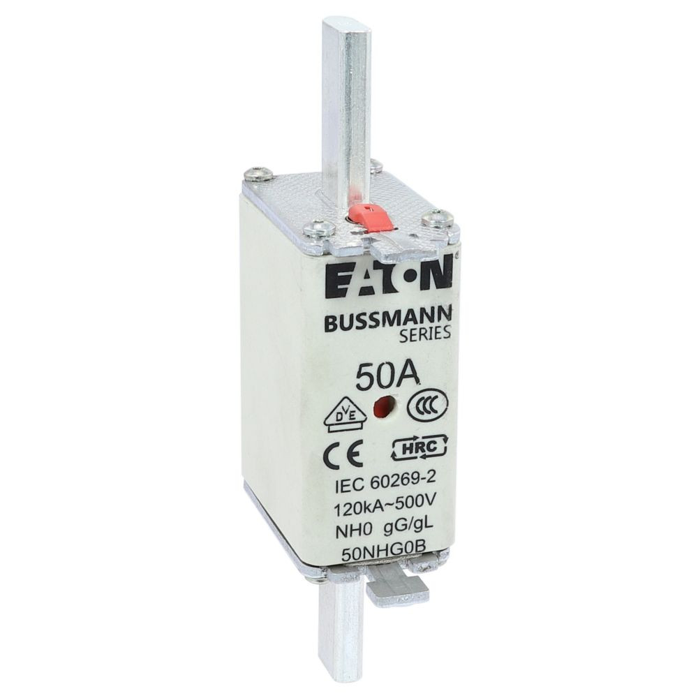 | Kurzbeschreibung | Sicherungseinsatz, Niederspannung, 50 A, AC 500 V, 120 kA, NH0, gL/gG, IEC, Doppelkennmelder, spannungsführende Grifflasche |