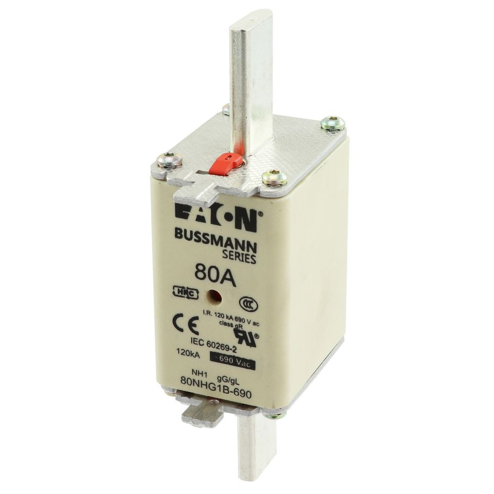 | Kurzbeschreibung | Sicherungseinsatz, Niederspannung, 80 A, AC 690 V, NH1, gL/gG, IEC, Doppelkennmelder, spannungsführende Grifflasche |